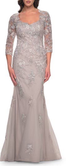 Elegant mermaid tulle and lace dress with unique neckline. Three quarter illusion sleeves. Back zipper closure.