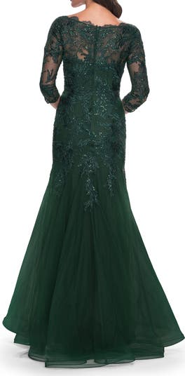 Mermaid mother of the bride dress with beautiful lace applique detail and scalloped neckline. Illusion three quarter sleeves. Back zipper closure.