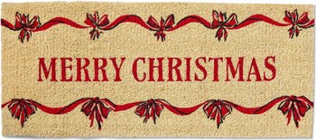 A festive and festive coir doormat featuring red bows and a "Merry Christmas" message. Perfect for welcoming guests during the holiday season.
