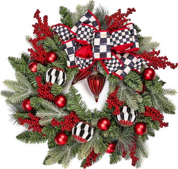 This festive Christmas wreath brings a sense of delightful magic to your home with its classic greenery bedecked with red-trimmed Courtly Check ribbons and aglow with warm lights.