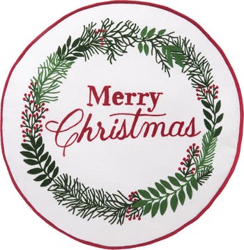 - Celebrate the holidays with this round accent pillow featuring a classic “Merry Christmas” wreath design with red berries and festive red piping, creating a timeless seasonal look that adds warmth and cheer to any space in your home.