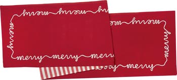 - Featuring elegant cursive "Merry" lettering around the border and a reversible candy cane stripe pattern, this table runner delivers two coordinated looks in one piece. The classic red and white tones pair effortlessly with traditional or modern décor.