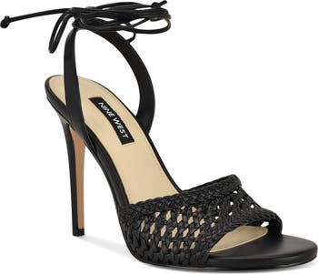 A woven and braided strap crosses the vamp of this sky-high stiletto with an adjustable tie-closure ankle strap.