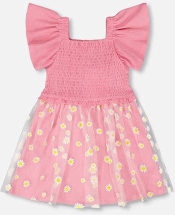 Delicate and breezy, our mesh and crinkle jersey dress with smocking in pink is made for sunny days. This sleeveless dress features stretchy smocking at the bodice, playful flutter straps, and a flared skirt with an allover daisy print. A joyful design that pairs perfectly with other cheerful looks from the “Explosion Of Daisies” collection.