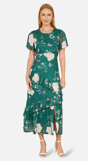 With wedding season fast approaching this bird and floral print midi dress is truly one of a kind. The kimono style sleeve, paired with a fitted design is complemented by the ruffles from hip to hemline. Made from lightweight mesh fabric that has stretch for comfort.