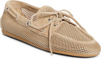 Suede accents contrast the airy mesh sidewalls and vamp of this big-on-charm boat shoe with a logo-embroidered tongue and set on a star-spangled sole.