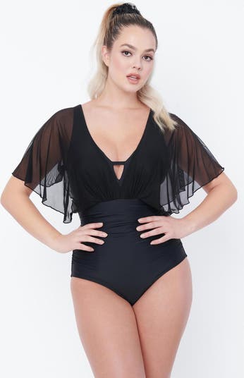 This ravishing 1960s style one piece swimsuit is cast in a nylon-spandex blend and featuring mesh butterfly sleeves. Outfitted with a plunging V-neckline, a back tie, and mesh lining.