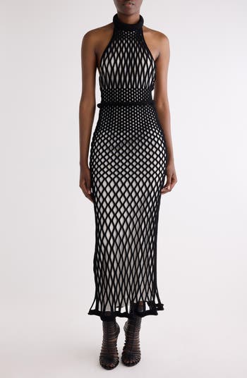 This striking, modern mesh dress blends daring design with Givenchy's signature architectural aesthetic. A padded tube forms the halter neckline, which is mirrored at the waist tie and the undulating hem. The graduated scale of the open mesh is backed with a contrast lining for an optical effect.
