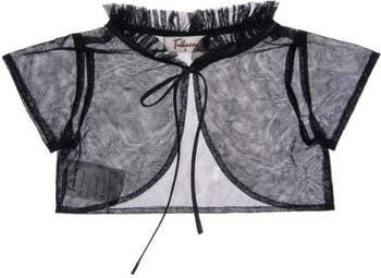 - 100% Polyester?Sheer tulle fabric with lightweight feel?Short-sleeved bolero silhouette?Ruffled collar adds delicate texture?Front tie closure with matching strings?Ornamental layering piece for formal styling?Imported