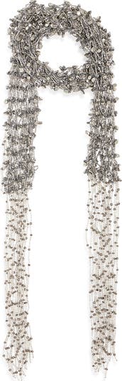 A scarf-inspired silhouette creates gorgeous drape in a necklace crafted from a net of shimmering beads.