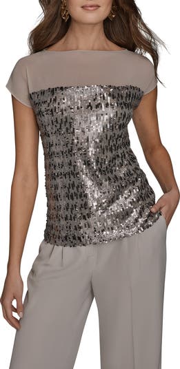 Capture the light (and the compliments) at your next special event in a mesh top adorned in cascading sequins.
