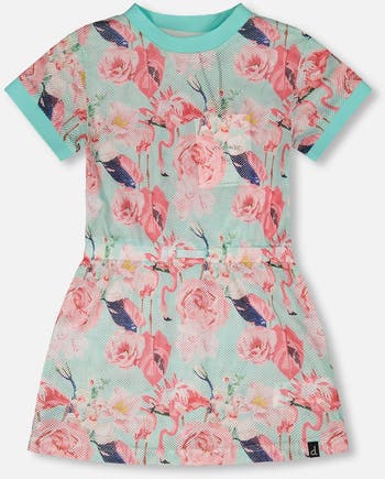 The mesh beach dress in blue with flamingo print is a playful cover-up for sunny days by the sea. Designed with short sleeves, an allover flamingo and flower print, and a comfortable crew neckline, this beach layer features an elastic waist with a drawstring for an adjustable fit. Lightweight and breathable, this piece adds a pop of color on top of any swimsuit.