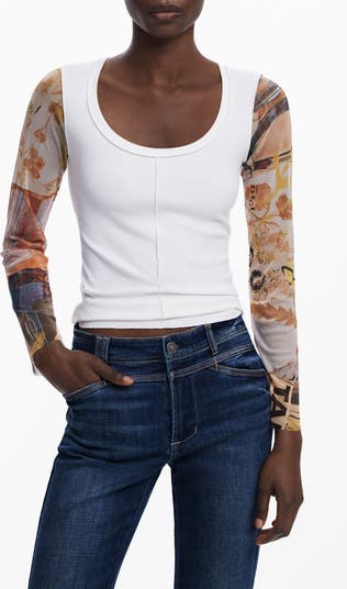 Patterned mesh sleeves add a playful spin to a ribbed-to-fit scoop-neck top that's sure to be an off-duty favorite.