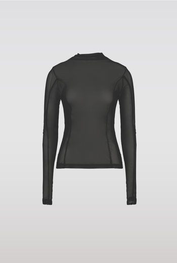 Black fitted mesh top with french seams on body, and long sleeves with thumb holes. This product is true to size. Model wears S and is 171cm.