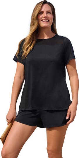 Confidently head for a dip with all the coverage and comfort you need in this short-sleeve swim tee. An ultra sheer mesh yoke and side bust shirring add feminine flair to this tee. Crewneck. Back pleats. Side slits.