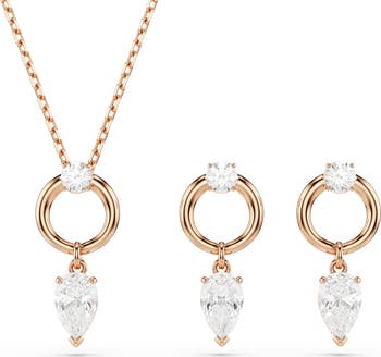 Give your ensembles coordinated warmth and shine with this necklace and earrings set detailed with pear-cut Swarovski zirconias.