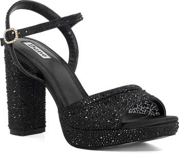 Sparkling, shimmering crystals heighten the occasion-ready elegance of an ankle-strap sandal set on a lofty platform sole.