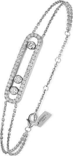 A pared-back design brings modern elegance to an 18-karat-gold bracelet punctuated with round-cut diamonds that freely move within a geometric charm.