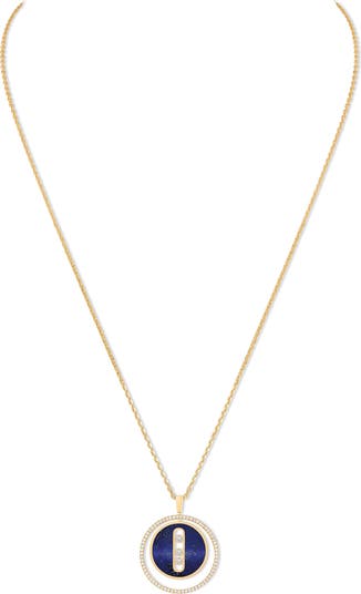 Brilliant diamonds bring out the intricate colors in the central lapis lazuli pendant on this warm 18-karat-gold chain-link necklace.