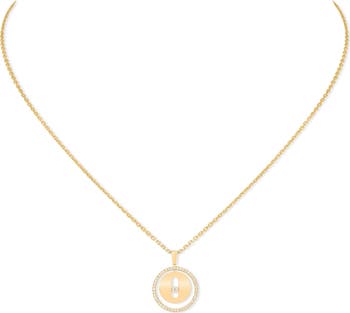 A new interpretation of Messika's Move collection, this necklace features a cutout pendant illuminated by a diamond bezel floating inside a pavé circle.
