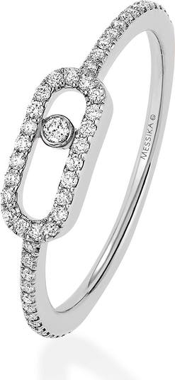Pared-back graphic lines bring modern elegance to a ring sparked with round-cut diamonds—one that moves within the geometric border.