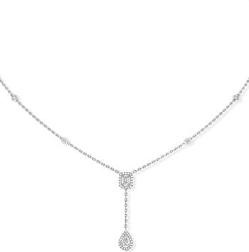 A mix of pear- and emerald-cut diamonds brings ethereal glamour to an 18-karat gold necklace embellished with micro-set diamond on the chain.