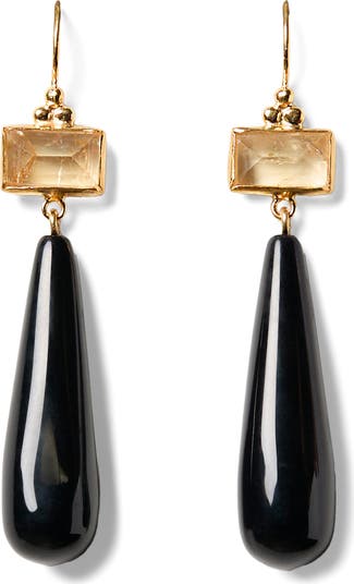 These handcrafted earrings bring glamorous movement with every turn of the head thanks to an elongated semiprecious-stone teardrop that swings beneath a sparkling, baguette-cut stone.