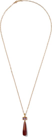The extralong chain length of this handcrafted necklace reflects the graceful, elongated form of the semiprecious-stone teardrop pendant that swings beneath a sparkling, baguette-cut stone.