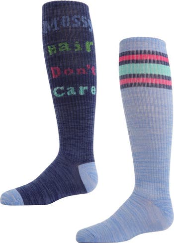 Perfect for a lazy day, these sassy socks are sure to pull any look together - even "just rolled out of bed." The Messy Hair Don't Care Knee High Socks say it all on the ankle, with cool colors and fun stripes adding some serious style to these not-so-serious knee highs