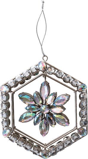 - A snowflake ornament, featuring a hexagon frame with acrylic jewels, all in a stunning silver finish