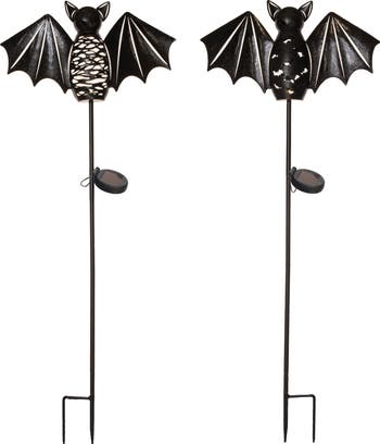 - Set of 3 decorative metal bat yard stakes featuring intricate punch detail for a spooky Halloween touch. Made from durable metal, these garden stakes are designed for outdoor use and can withstand various weather conditions. Battery operated with easy access to replace 3 AAA batteries, ensuring a hassle-free lighting experience. Perfect for Halloween home decorations, gift giving, or as unique hostess gifts to impress your friends and family.