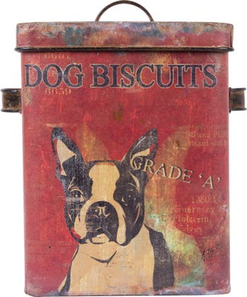 - A cute and colorful metal container that features a dog illustration and the text "Dog Biscuits" on the front and a matching lid