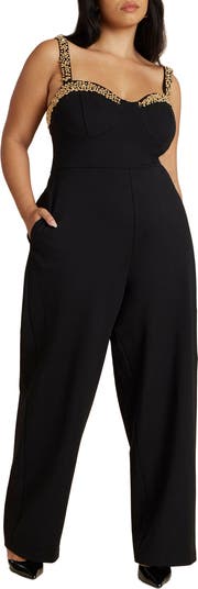 - An embellished sweetheart neckline and tailored bodice set a sleek tone in this evening-coded jumpsuit. With a loose trouser leg, functional pockets, & touch of stretch, it moves with you from cocktail hour to last call.