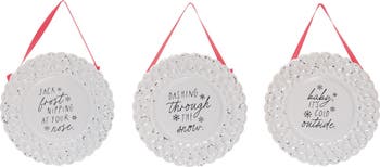 Enhance your holiday decor with the Transpac Metal and Fabric Embossed Round Sign Set of 3 These charming wall sign panels are perfect for adding a festive touch to your home this Christmas Each sign measures 6.89 inches in height and length with a slim width of 0.2 inches The elegant white color complements any decor style while the embossed design adds a unique texture Made from durable metal these signs are easy to care for simply spot or wipe clean Ideal for indoor or covered outdoor use this set of three signs will bring holiday cheer to your space