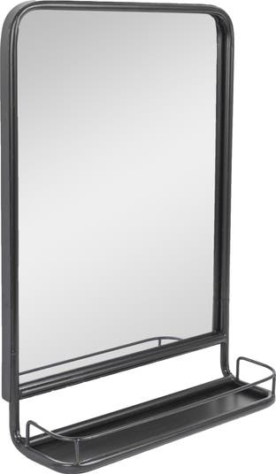 Add functionality and style to the home with this black metal framed rectangle wall mirror with a shelf. This sleek and contemporary wall mirror features a black metal frame with an attached shelf. The black metal frame adds some contrast and elegance to the wall, while the rectangular shape reflects light and opens up the space. The attached shelf adds convenience and storage space for essentials, such as toiletries, cosmetics, or accessories. This wall mirror is ideal for adding functionality and style to any living space, such as a bathroom, bedroom, or entryway. Hang it on its own or as part of a gallery wall. This wall mirror comes with hanging mechanisms for easy installation. It can be hung vertically. This wall mirror is made of metal, glass, and reclaimed wood, making it sturdy and durable. It measures 19.5 inches long and 27.5 inches high, making it a perfect size for any space. This mirror is a stunning piece that will add a touch of sophistication to any home.