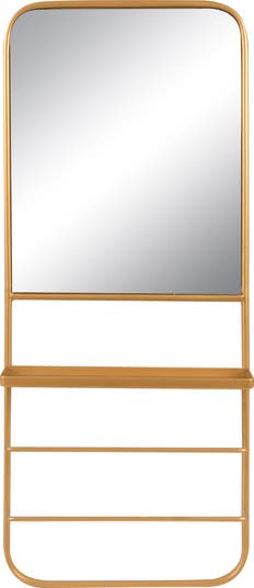 - Rounded edge, metal framed wall mirror with 2 hanging rods and a shelf in a gold finish; Incorporated hardware for easy mounting