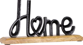 Add a rustic touch to your home décor with this "Home" table sign with a wooden base. Crafted with precision from solid black metal, this stylish piece features a charming heart symbol replacing the "O" in "Home", making it both durable and chic. Ideal for indoor use, this sign is perfect for adorning tables, shelves, or mantles, adding a sophisticated flair to any room. Product Features: Home table decoration Elegant solid black "Home" sign with a heart symbol replacing the "O" design Comes on a sturdy rectangular wooden base Felt pads on the bottom of the base to prevent damage to surface areas Perfect for tables or mantels Recommended for indoor use only Dimensions: 6.25"H x 12"W x 2.75"D Material(s): metal/wood