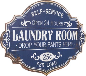 - Add a vintage and humorous touch to the laundry room with this metal wall sign with distressed finish in blue color