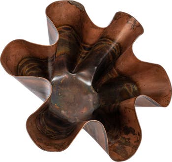 - A unique metal planter with an organic scallop shape and an oxidized copper finish