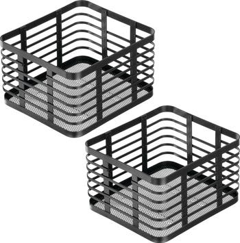 - Organize your pantry with this set of 2 matte black metal baskets. Perfect for storing snacks, fruits, and vegetables. The open wire design provides ventilation and easy visibility.