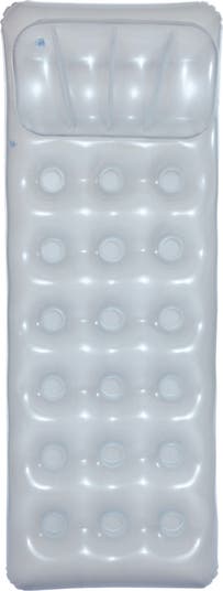 Relax, sleep or sunbath on our highly comfortable air lounge in and around the pool! Our 18 pocket airbed mattress with transparent top and reflective metallic colored bottom comes in a sturdy coil beam construction. The I-beam constructed air pillow adjusts to your personal comfort. Made of durable PVC, the extra thick air compartments ensure comfort even when used on the ground/floor. Comes with a repair patch kit. Inflated Dimensions: 76"L x 29"W; Capacity: 198 lbs.