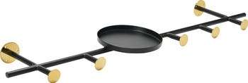 - An artfully designed metal wall hook with one round shelf has five handy hooks