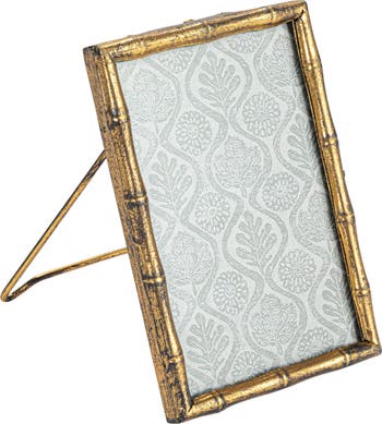 This antique gold metal photo frame is a stunning addition to any home or office. It features a distressed gold stamped-metal border shaped in the form of wood. The frame holds a 4x6-inch photo, making it suitable for showcasing family portraits, vacation memories, your favorite pets, or treasured art or clippings. The frame has an easel back stand for easy display. Whether in a traditional, boho, or Asian-inspired space, this unqiue frame is sure to show-off your images in style.