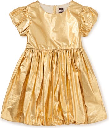 Designed to make every moment feel like a celebration, this shimmering gold dress is a true standout piece. The voluminous bubble skirt and puff sleeves bring playful drama, while thoughtful details like on-seam pockets and a protective interior zipper guard keep it practical and comfortable. Fully lined in soft cotton poplin, it's perfect for special occasions, holiday photos, and every twirl-worthy moment in between.