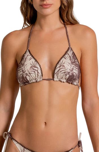 This shimmer-kissed triangle bikini top is outlined in blanket-stitch embroidery and made with bead-tipped ties.