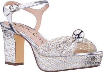 Polished goldtone hardware and high-shine metallics bring striking luster to an ankle-strap platform sandal fitted with a cushioned footbed and lifted by a lofty block heel for poised, confident wear.