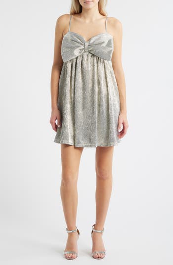 Sweeten the occasion in this sparkling metallic mini designed with an oversized bow at the bust and a swingy babydoll silhouette.