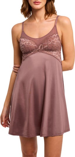 You'll be feeling both flirty and supported in this shimmery chemise featuring a built-in wireless bra made with side slings for forward lift.