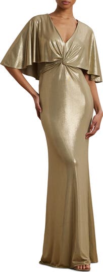 Turn every head in a gilded gown gracefully draped in a caped bodice and served in an elegantly columnar silhouette.