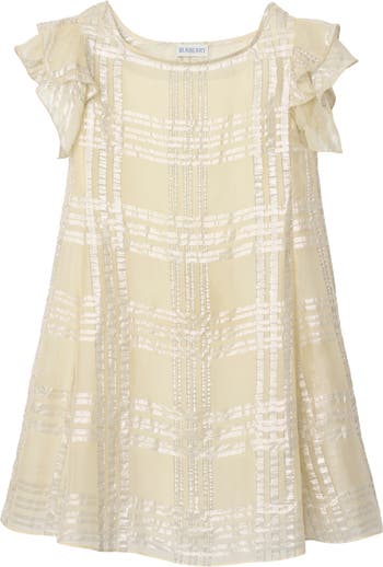 A check dress in fluid sheer silk, woven with metallic fibres for a subtle shimmering finish. The gently flared silhouette features ruffled cap sleeves and a cupro lining to enhance its layered design.||Side zip closure|Cupro lining